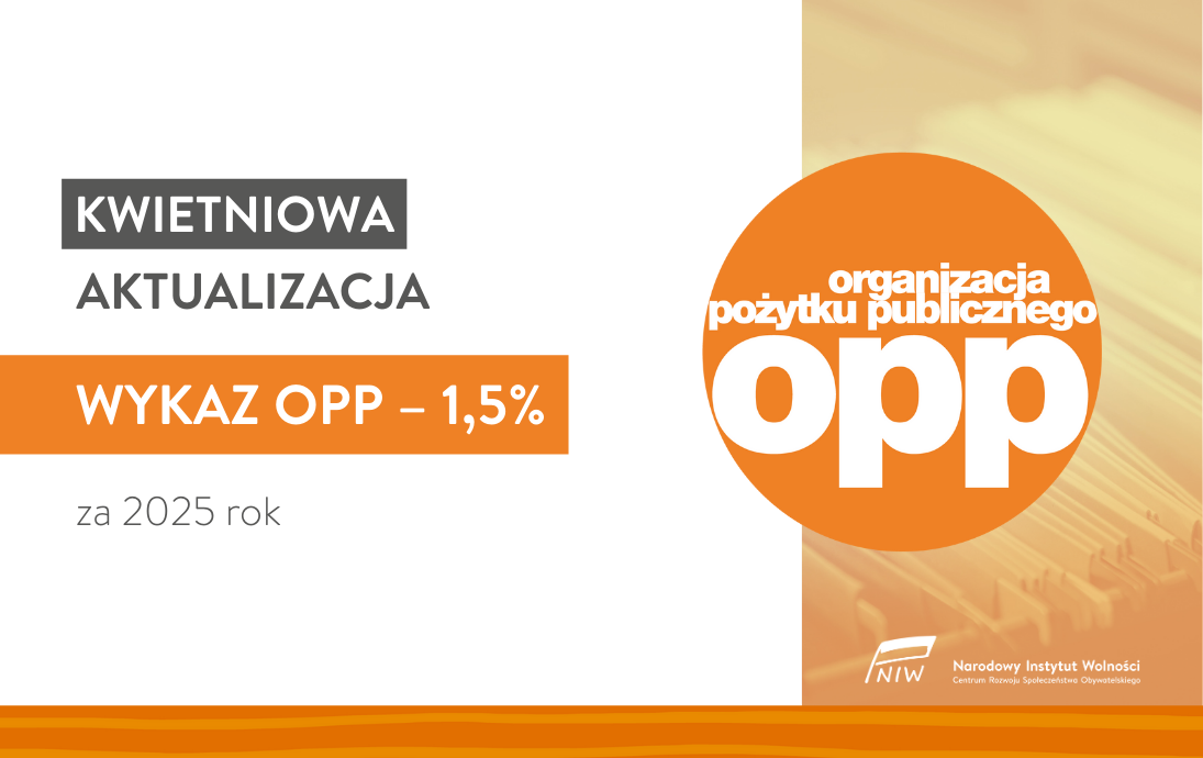 Dyrektor Narodowego Instytutu Wolności – Centrum Rozwoju Społeczeństwa Obywatelskiego (NIW-CRSO) na podstawie danych otrzymanych z Ministerstwa Sprawiedliwości zaktualizował 16 kwietnia 2026 roku wykaz organizacji pożytku publicznego uprawnionych do otrzymania 1,5% podatku dochodowego od osób fizycznych za 2025 rok w 2026 roku.